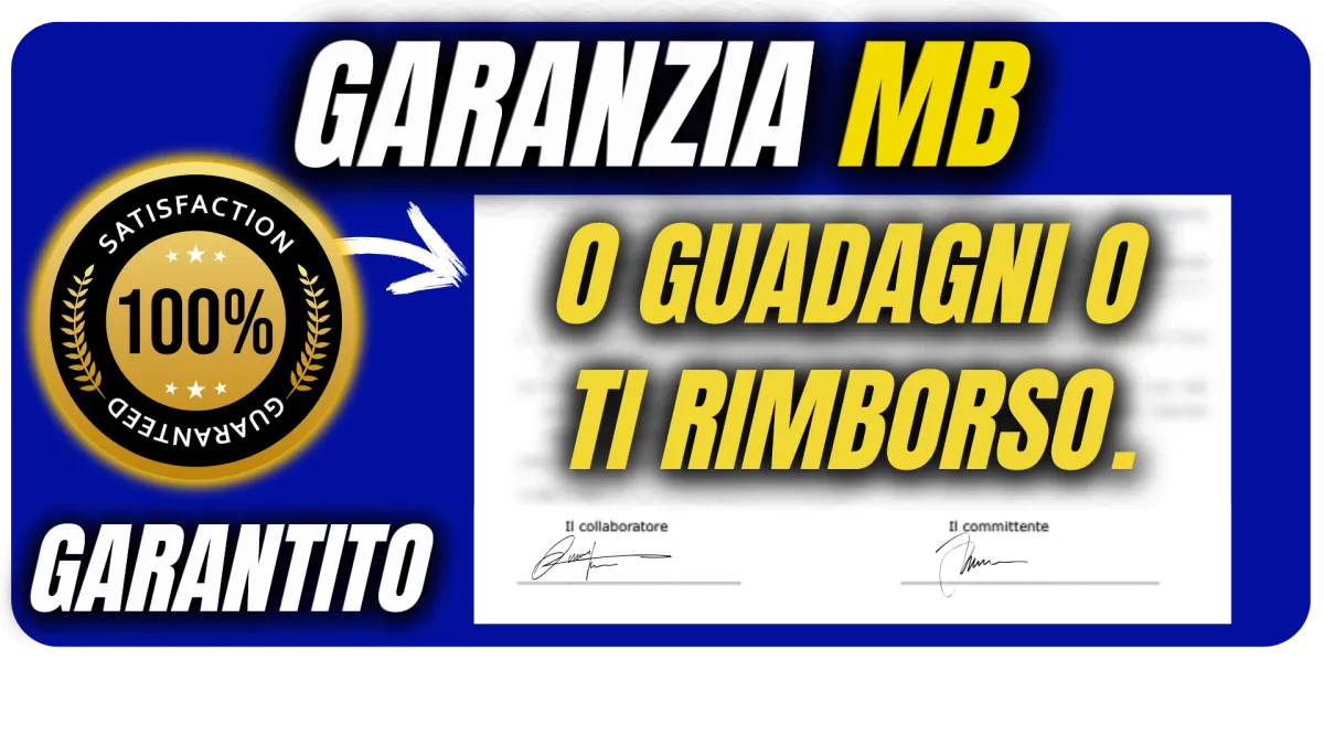 • E per non farci mancare niente avrai anche a disposizione la Garanzia Contrattuale MB… Soddisfatto o Rimborsato, cioè avrai a disposizione tutti gli strumenti necessari per iniziare a guadagnare.