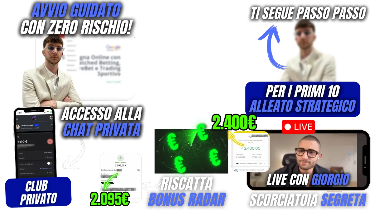 • Il BONUS RADAR, al cui interno troverai l’elenco top-secret delle piattaforme altamente selezionate che offrono bonus da 200€ ,300€ -500€ senza rischiare un centesimo. Così che non dovrai neanche andartele a cercare e rischiare di farti del male. Abbiamo fatto noi tutto il lavoro per te e tu puoi goderti i frutti.
